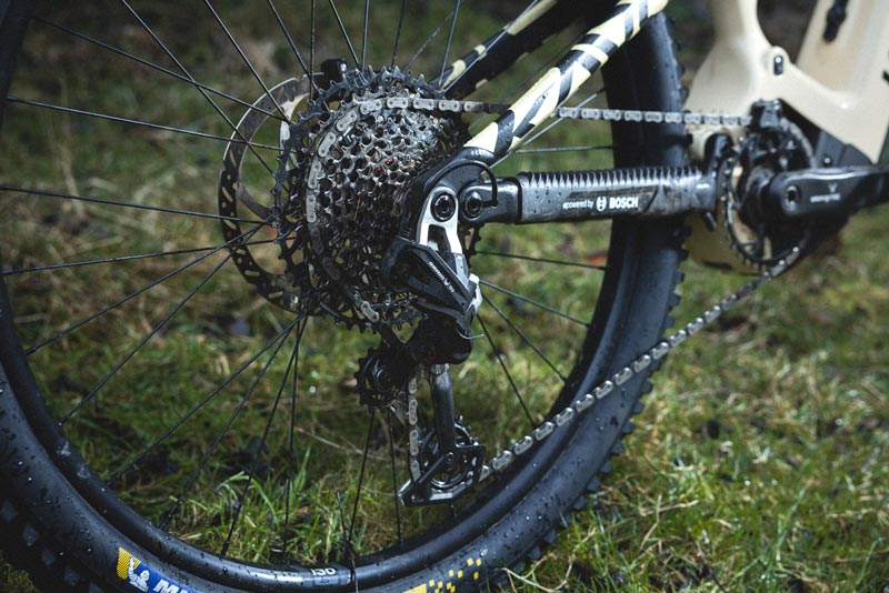 SRAM Eagle 70/90 Drivetrain | SRAM’s mechanical T-Type drivetrain worked flawlessly throughout testing, shrugging off impacts and sticks and shifting smoothly every time. Very impressive.