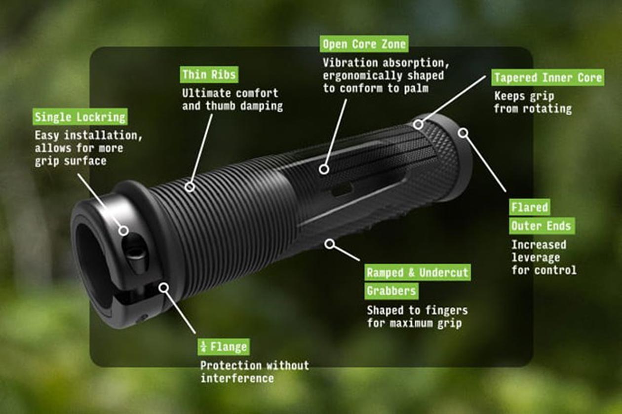 Designed to deliver the comfort of a slip‑on with the security of a lock‑on, Open Core Thrice grips are packed with hidden features that transform the way your hands connect to the bike. From a vibration‑absorbing Open Core Zone and ovalized profile to finger‑shaped grabbers and thin, thumb‑damping ribs, every contour is designed to enhance comfort and control.