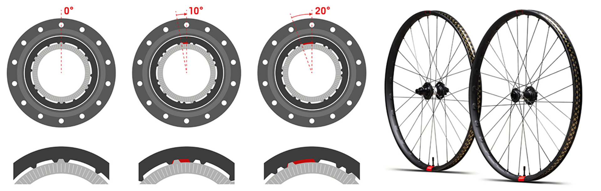 The 20° setting is for ultimate downhill suspension performance. This is the setting for gravity-fed riding where ratchet engagement isn’t a priority, and your suspension needs to work at its best. Riders on 30|DH wheels will likely want to give the 20° setting a shot.