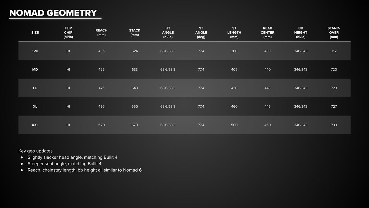 The new Nomad might look a bit like the older one, but sometimes the smallest changes make the biggest difference. The head angle’s a hair slacker, and now matches the Bullit at 63.6 in Hi and 63.3 in Lo. We’ve also tweaked the kinematics on our tough, tuneable, VPP suspension to eke out even more performance.