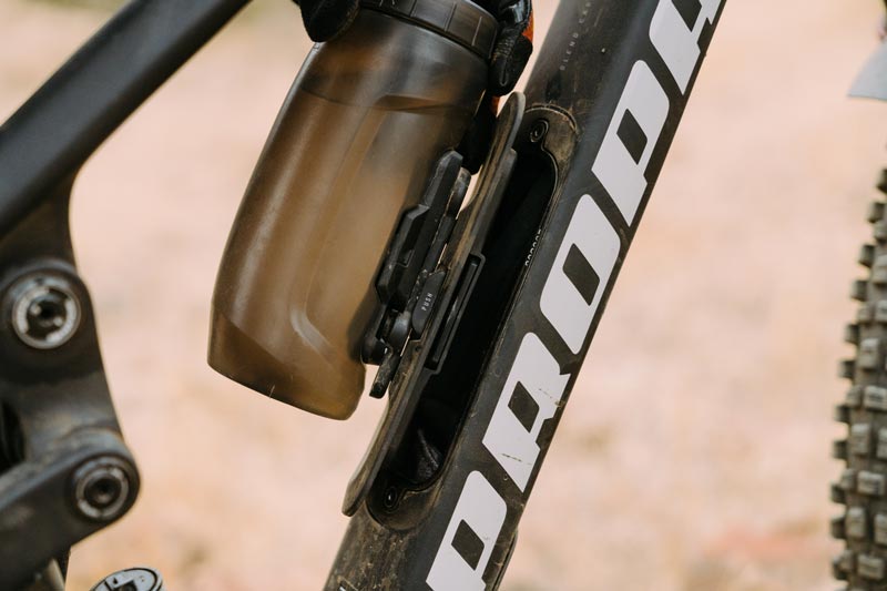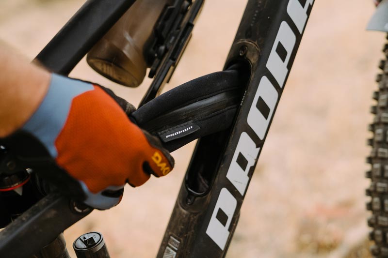 Perhaps most notable is the downtube storage (topped with water bottle bosses) on the new Hugene. The door is relatively easy to open thanks to a sliding latch, and Propain provides two bags to store all your goodies safely inside, without rattling.