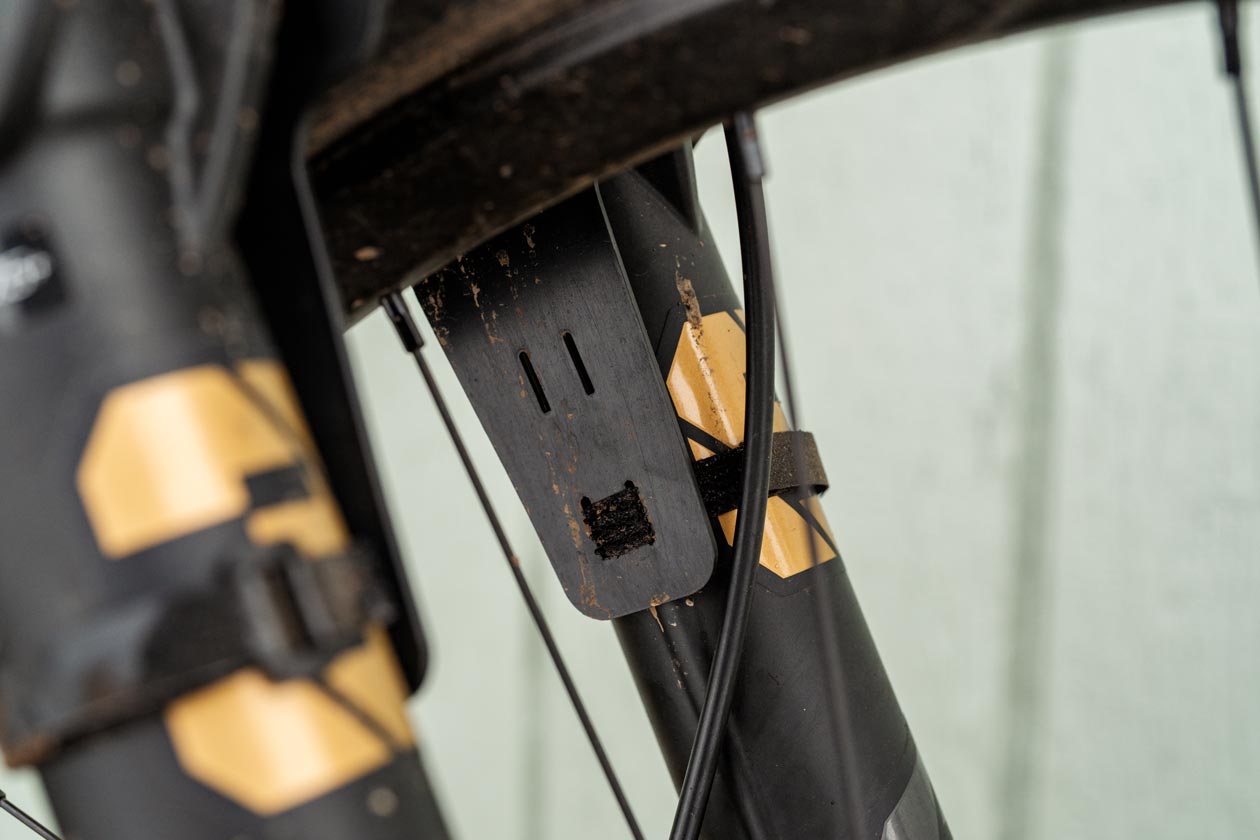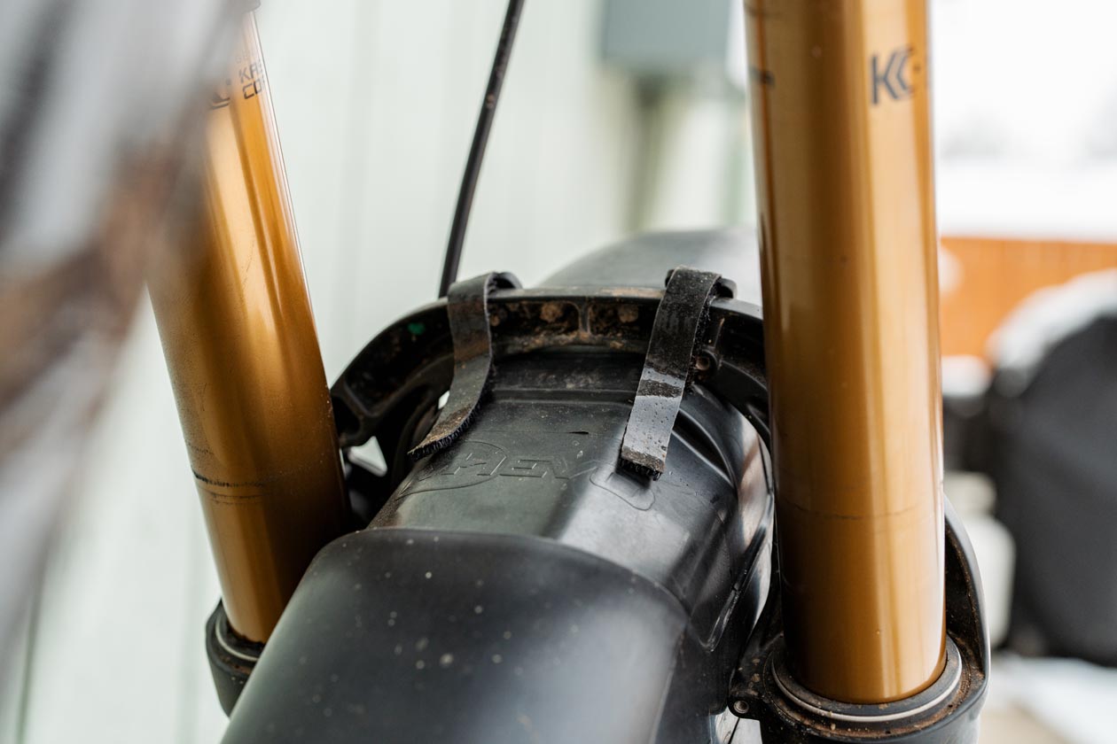 Installing the fender was straightforward. I simply fed the straps through the slits and cinched them up. There are three upper mounting options and two on the sides, with the slits precut in the fender. I opted for the lower fork leg position and the two outside slits up top. Since there are three slits up top, you can opt to position the fender biased slightly forward or rearward. I found that using the two outer slits put the fender in a great position on the fork’s arches I was testing with.