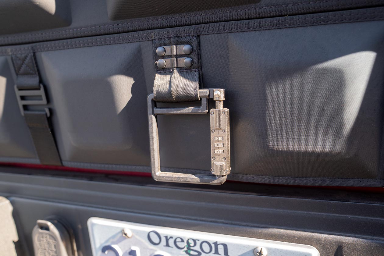 FEATURES | The Cache Basecamp 3.0 Tailgate Pad is currently the only pad on the market to have a built-in lock. Utilizing a locking carabiner and thick nylon strap hiding a 5mm steel cable, Cache aims to deter pad theft. The locking carabiner can also be used with most cable locks for added security.