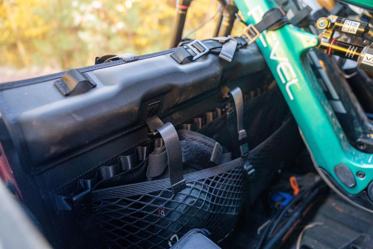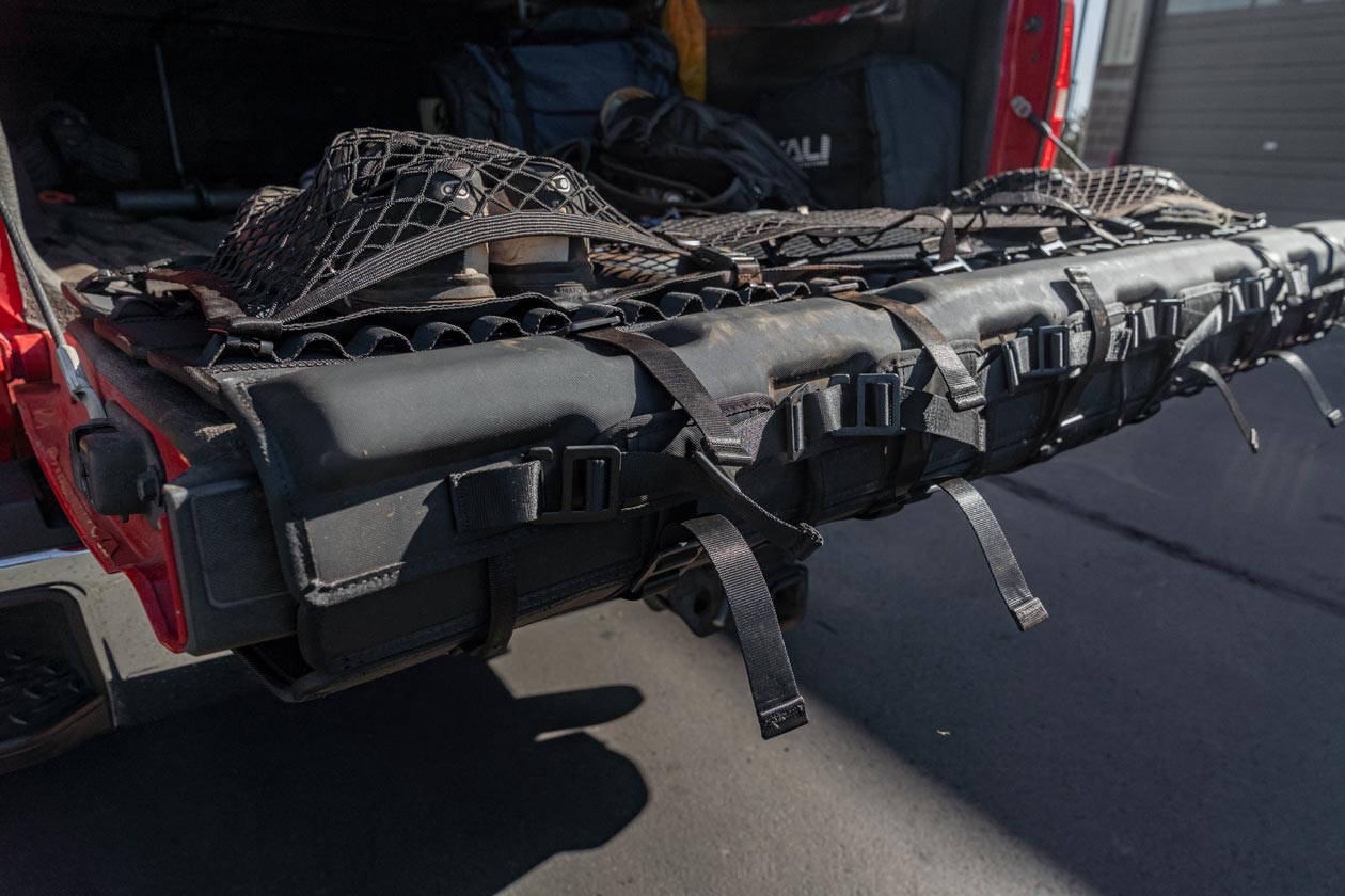 With the Basecamp Pad 3.0 successfully installed, it was time to add the accessories. Cache sent their Skid Plate, Cargo Net and extra bike straps. The Skid Plate installed simply by placing it on the inner edge of the tailgate pad, and the g-hooks slid into the Molle webbing on the pad. The g-hooks were snugged down, and the bike straps were mounted to the Skid Plate, ready for transport. The Cargo Net also slid into more of the Molle webbing on the inner panel of the tailgate pad.
